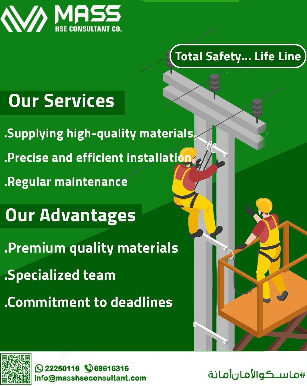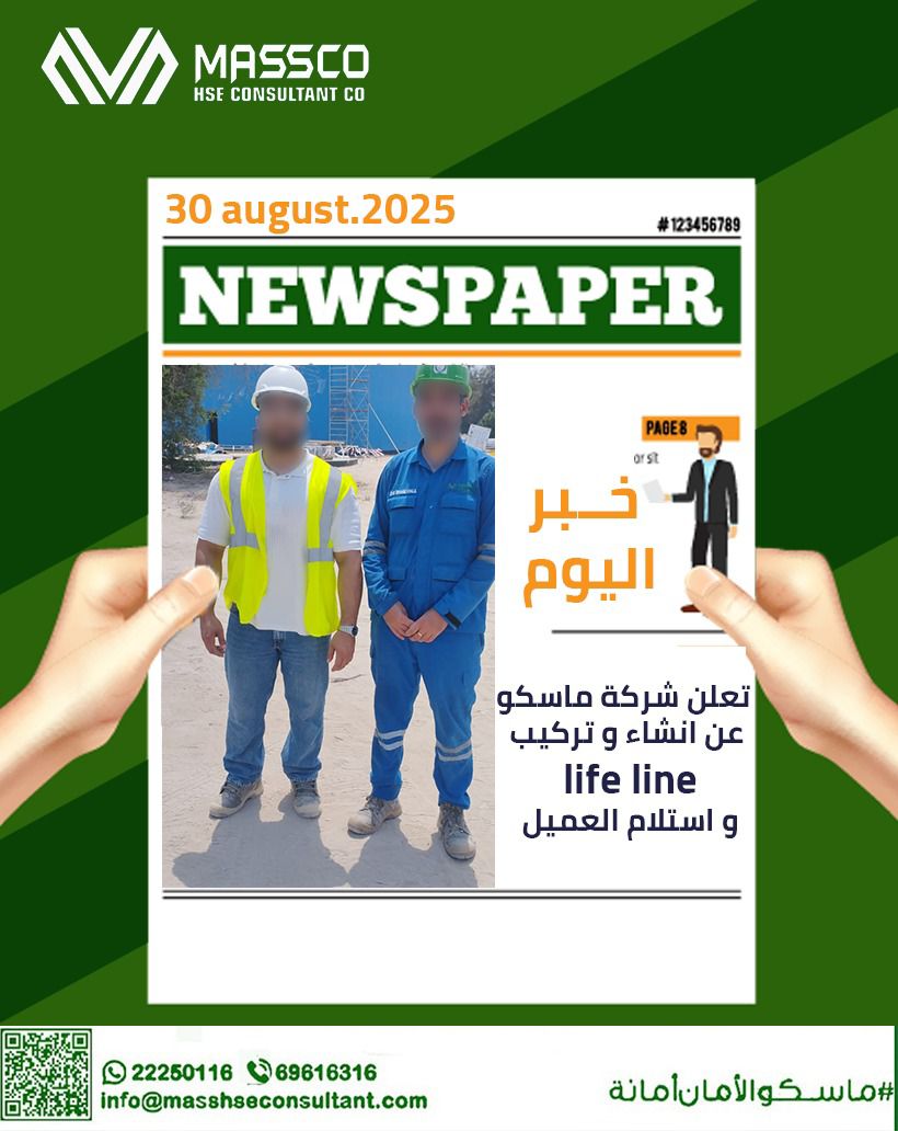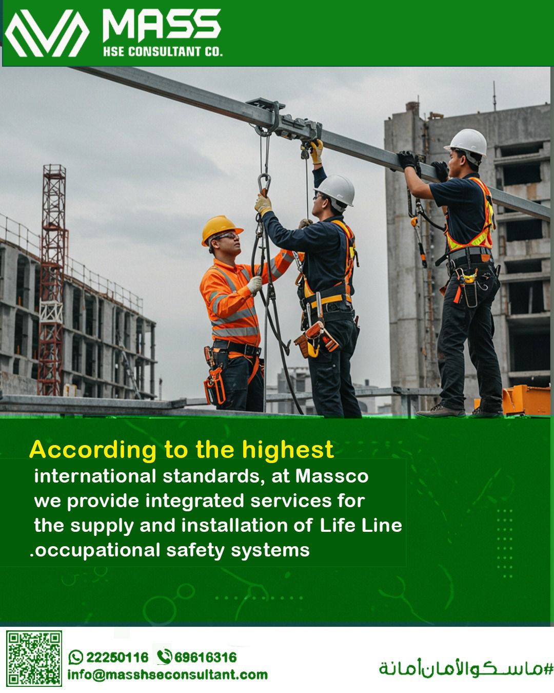 1. System Overview / نظرة عامة على النظام: A Horizontal Life-Line (HLL) is a safety system installed at height to protect personnel from falls. It consists of stainless steel cables or ropes, anchors, intermediate supports, tensioning devices, and harness attachment points. الخط الحياة الأفقي (HLL) هو نظام أمان يتم تركيبه على ارتفاع لحماية العاملين من السقوط، ويتكون من أسلاك أو حبال من الفولاذ المقاوم للصدأ، ونقاط تثبيت، ودعامات وسطية، وأجهزة شد، ونقاط ربط للأحزمة. 2. Design / التصميم: Purpose / الهدف: To provide a continuous, safe anchorage for workers at height. To comply with OSHA, EN 795, ISO 14567, ANSI Z359 standards. Scope / النطاق: Roofs, industrial platforms, walkways, and facades. Designed for max. 2–5 users per line, depending on span and anchors. Design Considerations / اعتبارات التصميم: Total system length, span between intermediate supports (max 6–8m typical). Anchor strength, material (galvanized or stainless steel). Load calculation including fall arrest forces, impact load, and safety factor. Environmental factors: wind, seismic load, snow, and corrosion. الاعتبارات: طول النظام والمسافة بين الدعامات (عادة 6–8 م). قوة نقاط التثبيت وموادها. حساب الأحمال الناتجة عن السقوط، الحمل التأثيري، ومعامل الأمان. عوامل البيئة: الرياح، الزلازل، الثلوج، والتآكل. 3. Installation / التركيب: Steps / خطوات التركيب: Site Survey / مسح الموقع: Determine optimal route, anchor points, and obstacles. Anchor Installation / تركيب المثبتات: Fix primary and intermediate anchors to structure per design. Cable / Rope Installation / تركيب الحبال: Run stainless steel cable or wire rope through anchors. Tensioning / الشد: Apply calculated tension using tensioning devices; check deflection limits. End Fittings & Hardware / تركيب الملحقات: Secure turnbuckles, clamps, and termination points. Marking & Signage / التعليمات التحذيرية: Post load limits, usage instructions, and warning signs. Safety During Installation / السلامة أثناء التركيب: Workers must wear full fall arrest harness. Use temporary scaffolding or MEWPs for high areas. Verify structural strength before installation. 4. Testing / الاختبار: Purpose / الهدف: Verify system integrity, tension, and anchor strength before use. Ensure compliance with EN 795 / ANSI Z359 / ISO 14567 standards. Testing Methods / طرق الاختبار: Visual Inspection / الفحص البصري: Check for corrosion, damage, or improper installation. Tension Test / اختبار الشد: Measure cable tension using calibrated load devices; ensure correct sag and tension. Pull-Out / Anchor Test / اختبار الشد للمثبتات: Apply rated pull force to each anchor and verify structural holding. Function Test / اختبار الأداء: Attach dummy load or test weight and simulate fall arrest; check system response and deflection. Frequency / التكرار: Initial test after installation. Annual inspection and retest, or after any fall incident. Acceptance Criteria / معايير القبول: No permanent deformation in anchors or cable. Tension within design limits. All hardware intact and properly installed. Maximum deflection within calculated values. 5. Documentation / التوثيق: Design Drawings / مخططات التصميم: Route, anchors, tension values, calculations. Installation Report / تقرير التركيب: Date, installer, deviations, pictures. Testing Report / تقرير الاختبار: Tension readings, pull-out results, pass/fail, inspector signature. 💡 Notes: HLL systems are intended only for fall arrest, not for lifting loads. Users must always wear a compatible harness and shock-absorbing lanyard. Regular maintenance and inspection are mandatory to maintain safety.